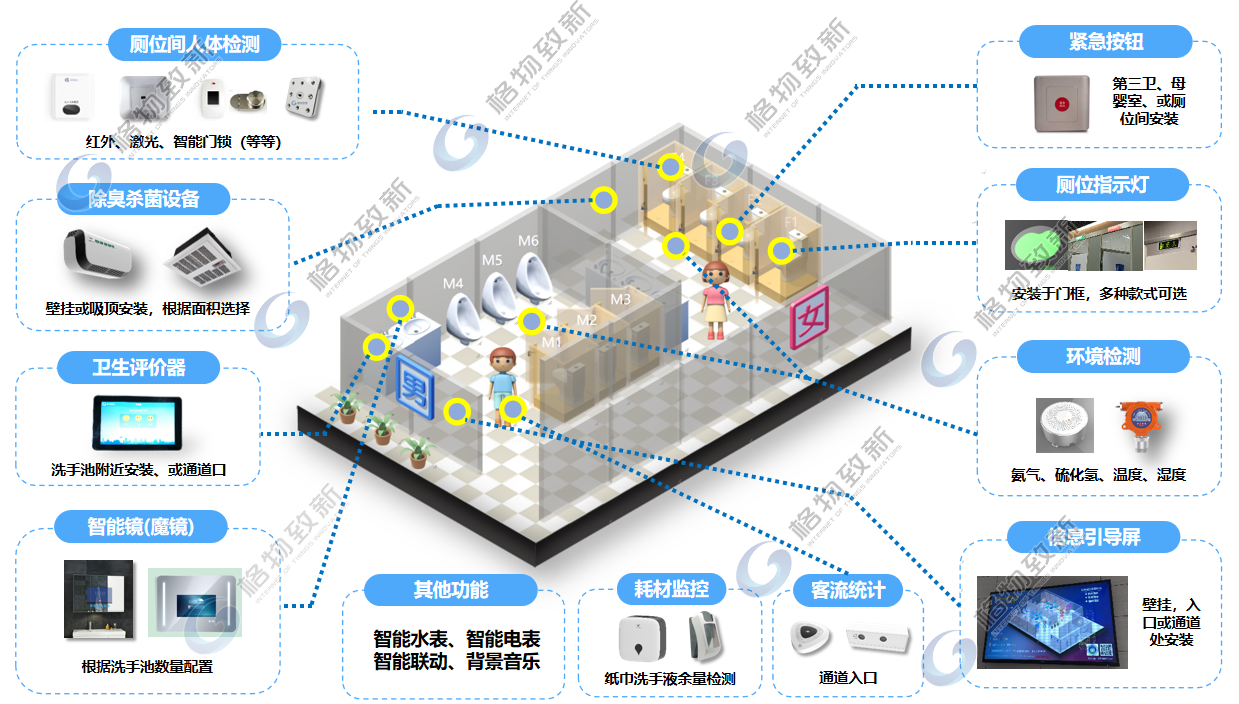 对厕所内部的环境进行监测,包括异味(气体)、温湿度、水浸、自动消毒(马桶)、地面冲洗等,均可自动联动控制。以及用户的紧急求助,烟雾触发的报警通知等。